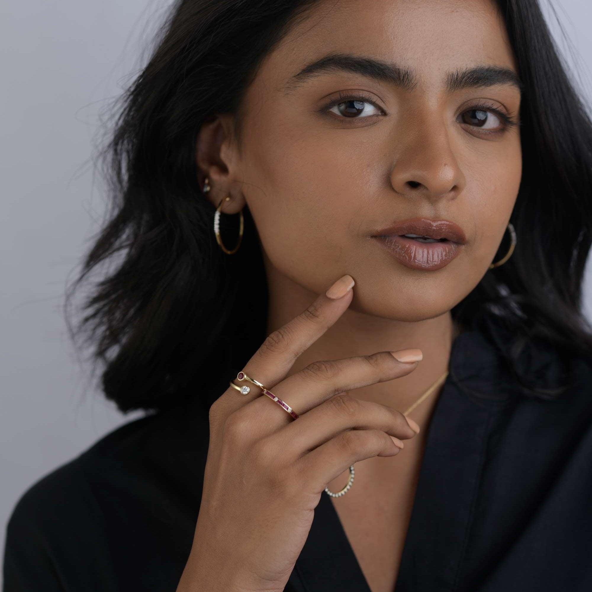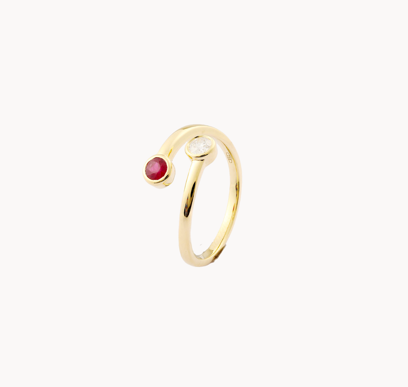 One diamond and one ruby, set in an open ring design for a modern, balanced look.