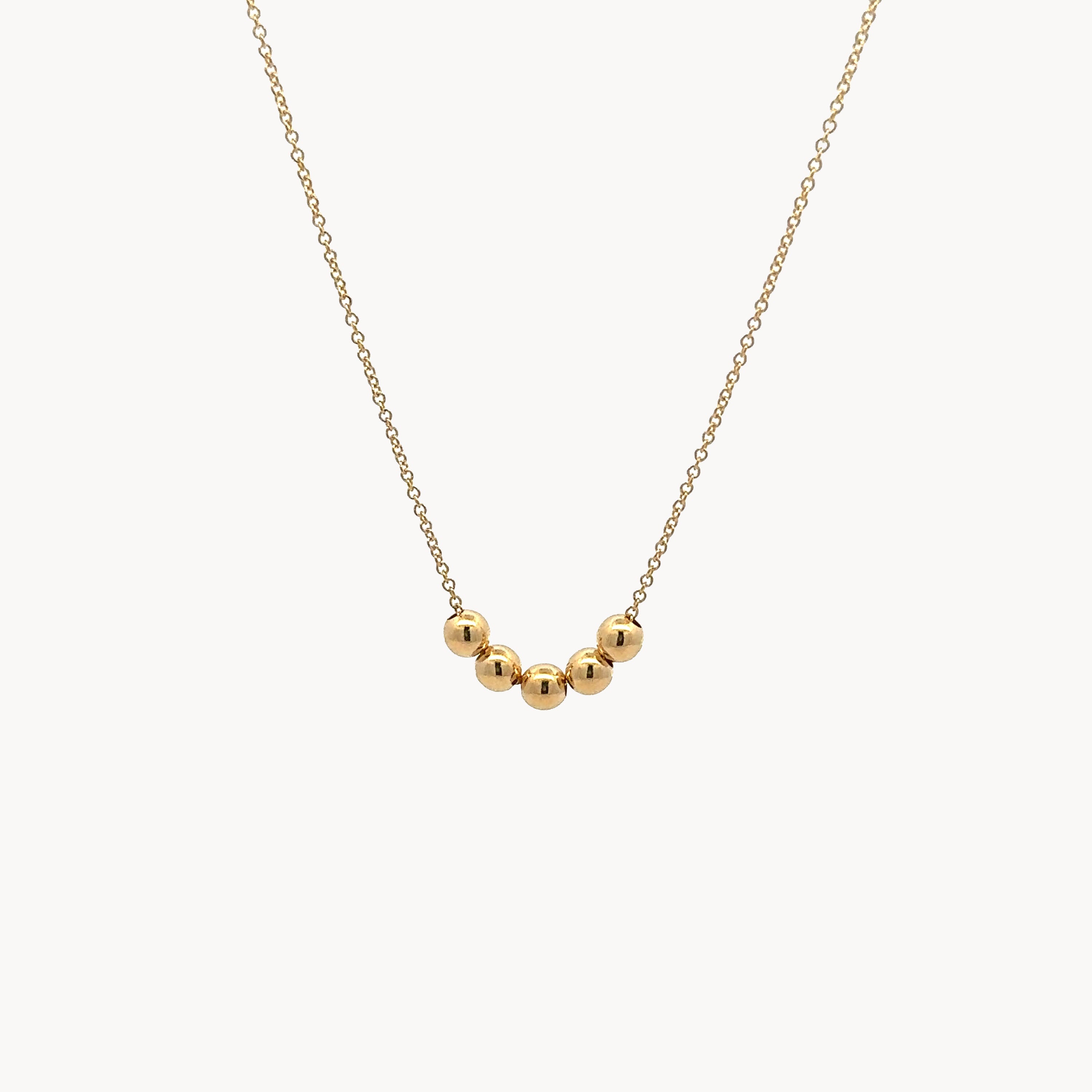Elegant arrangement of five perfectly round gold spheres along a delicate chain. Balances simplicity and sophistication for a timeless, eye-catching effect.