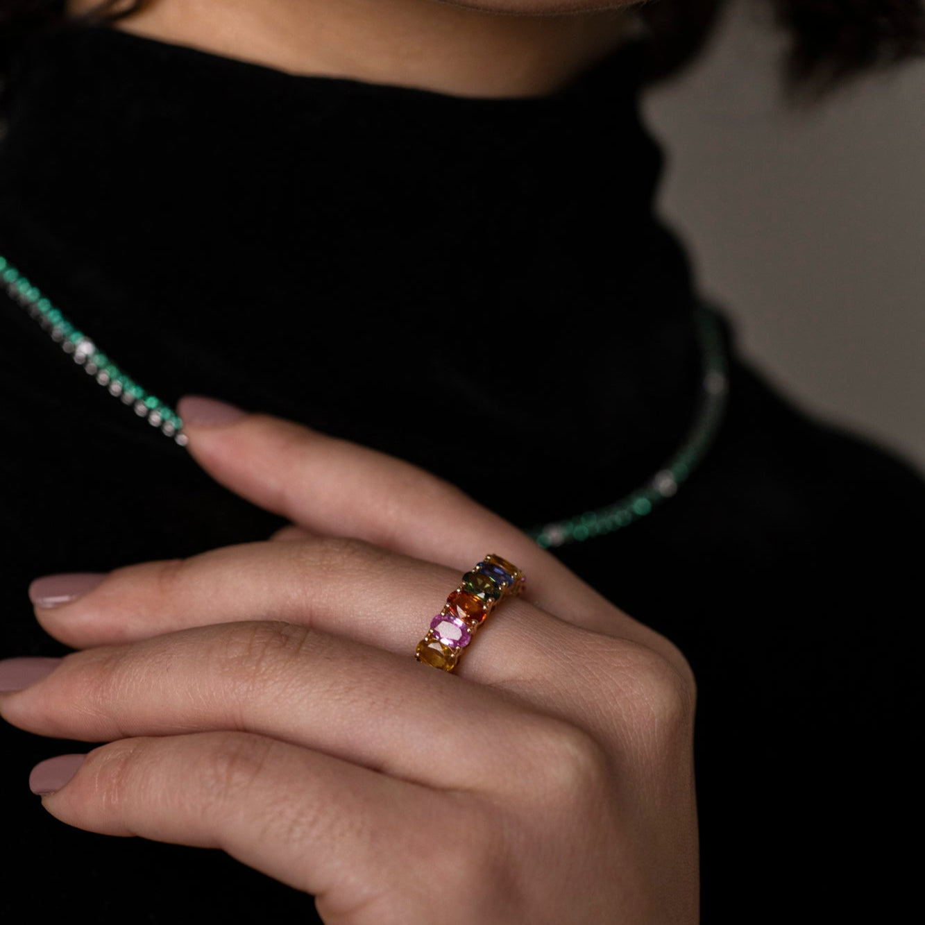 A rainbow of natural sapphires creates a joyful celebration of color in this artfully arranged cocktail ring.