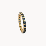 A smooth ring band set with deep blue sapphires along its surface. A versatile piece that combines timeless style with a rich, royal hue.