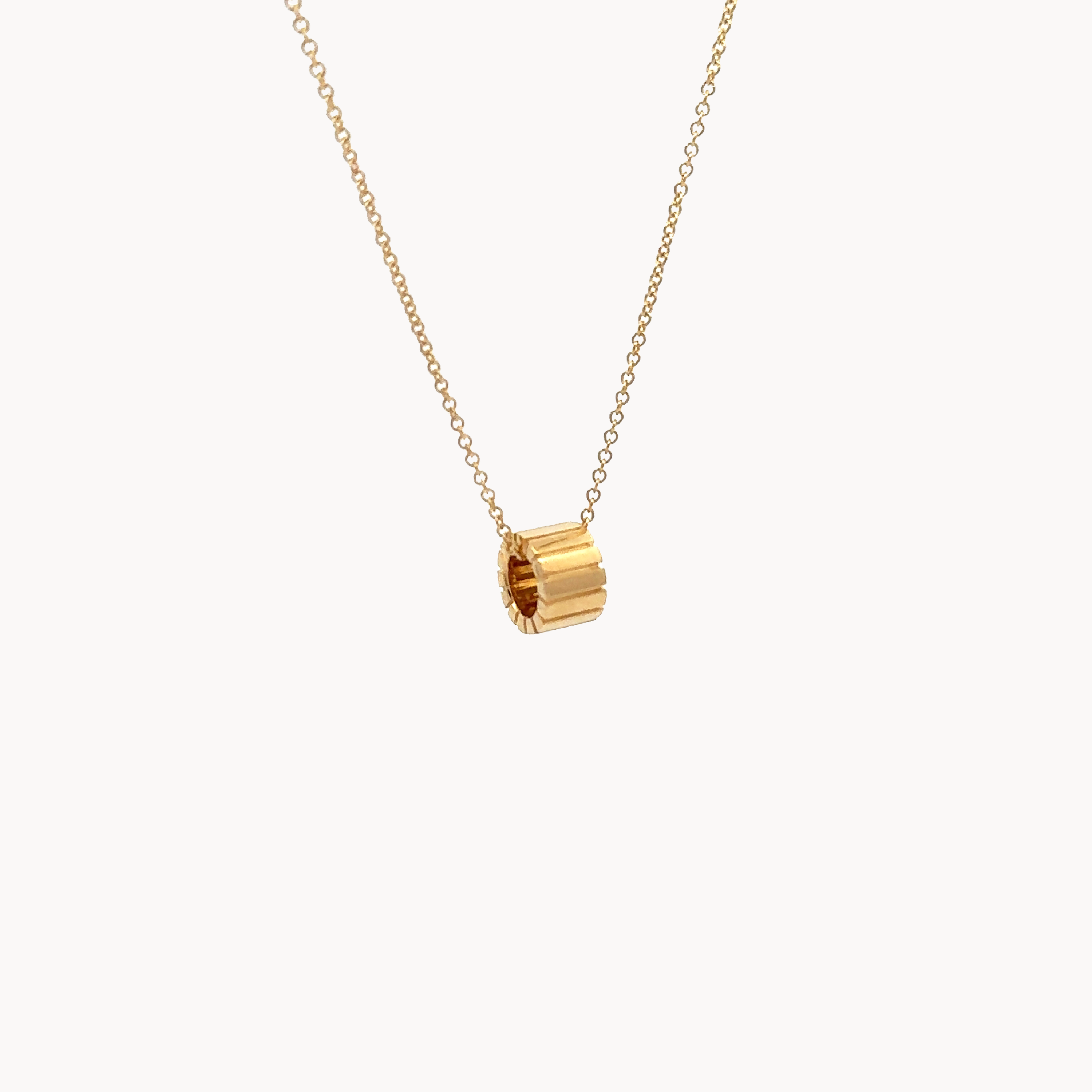 Bold tube pendant with intricate ridge detailing along its length. Combines minimalist design with subtle texture for a contemporary look.