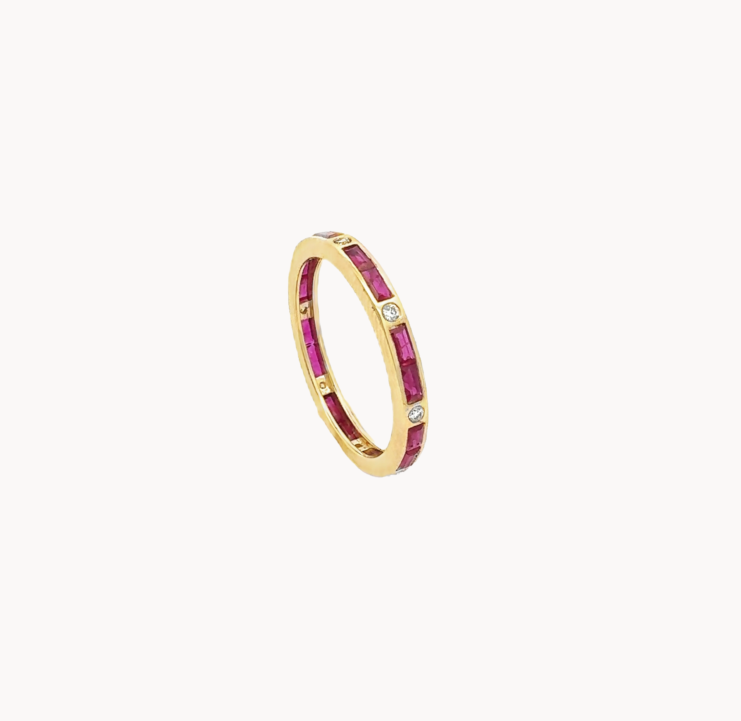 Diamonds dance along a rich ruby embrace. Eight brilliant diamonds nestled in a luxurious ruby band for a truly regal look.