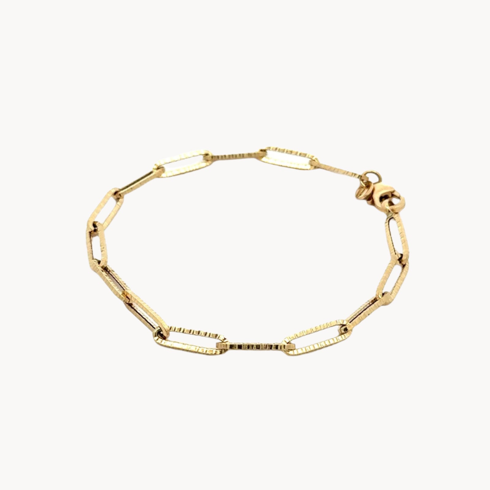 A simple yet elegant 18k gold bracelet shaped like connected paperclips, with a gently hammered texture that sparkles in the light.