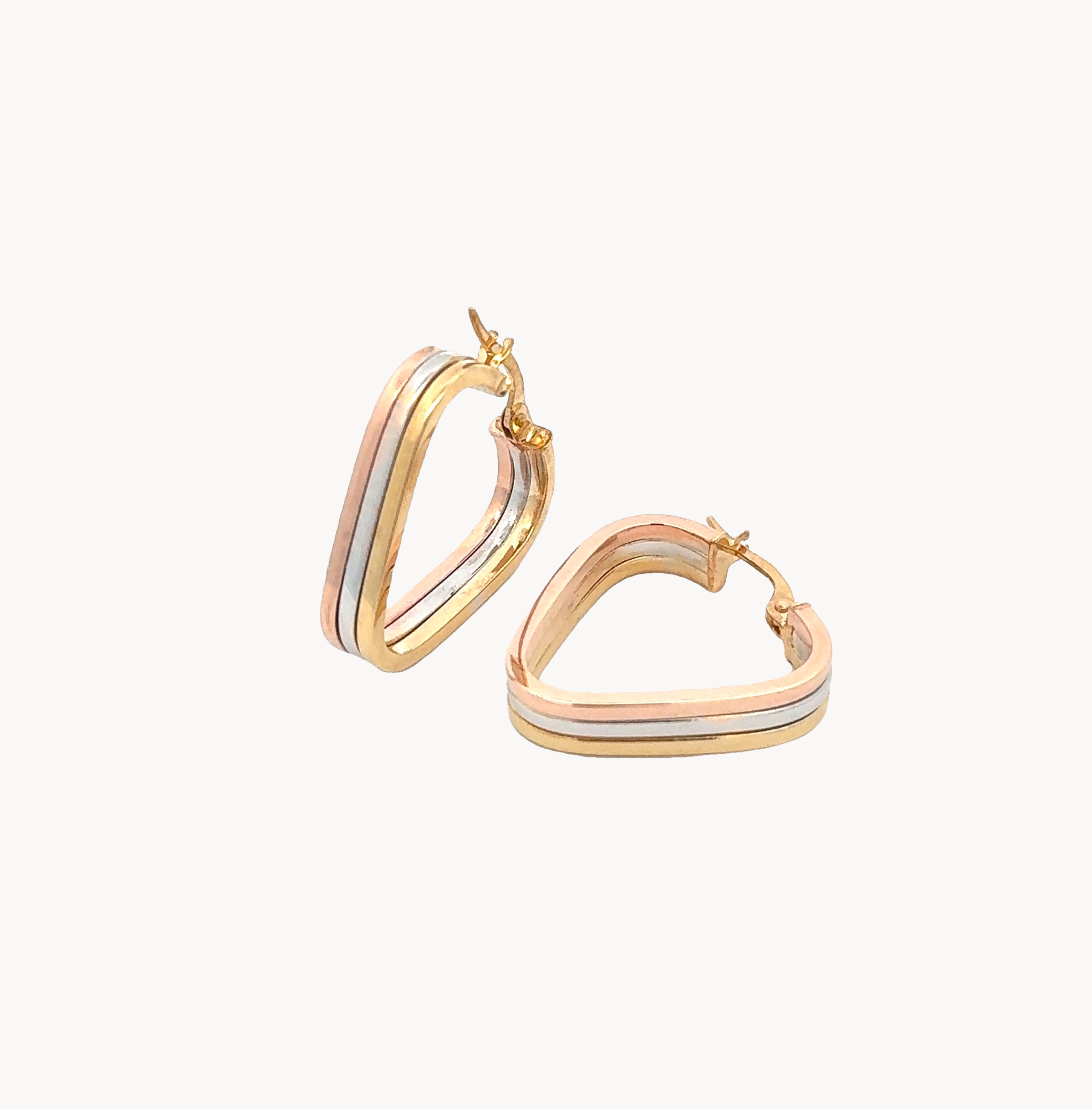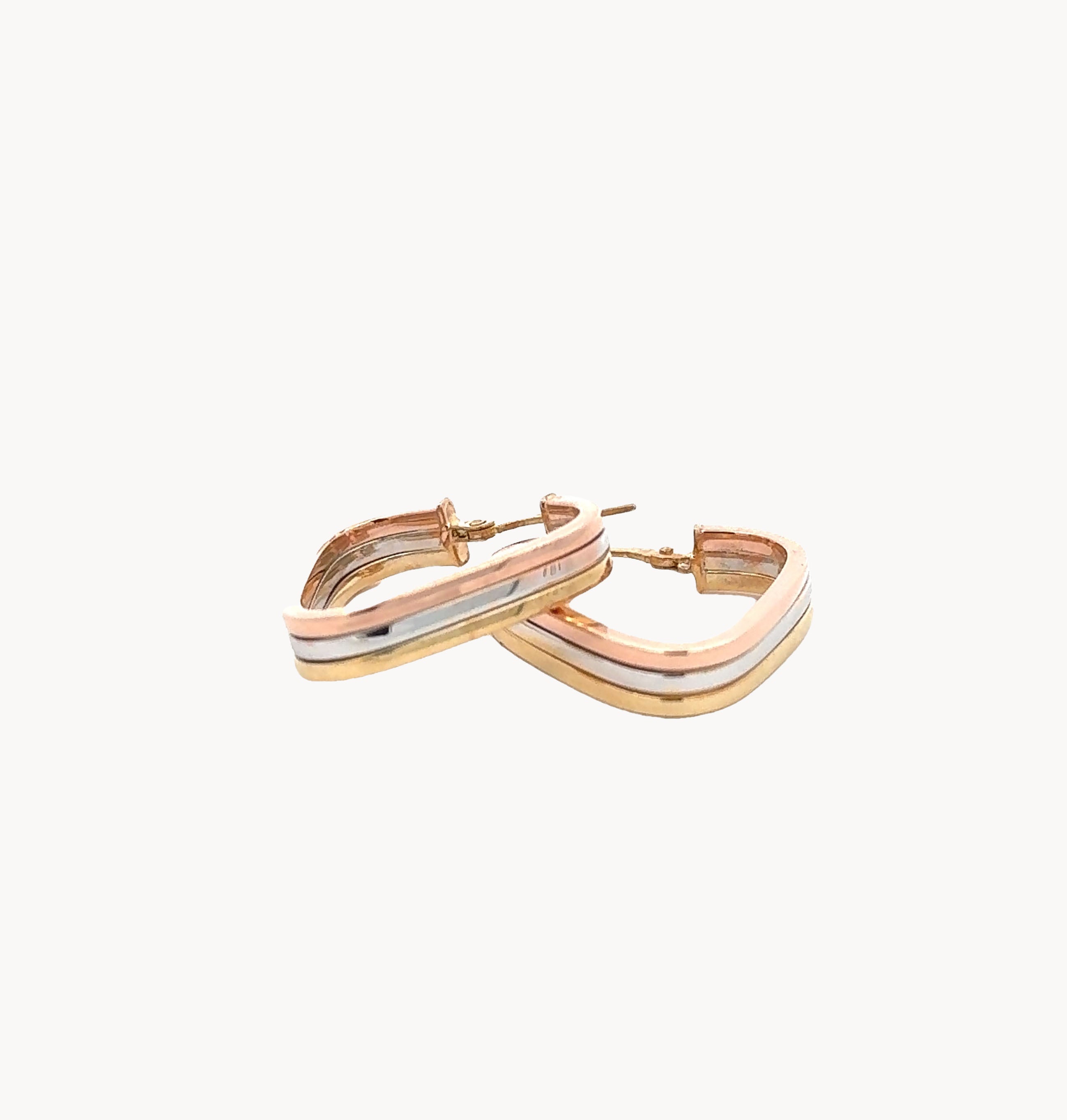 Where geometry meets luxury: tri-toned solid gold triangular hoops that bring modern sophistication to any outfit.
